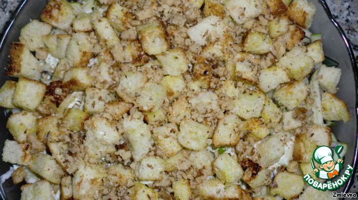 Выложить на салат сухарики и посыпать дроблеными грецкими орехами.