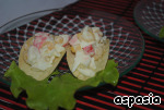 Взять чипсы и выложить на них салатик. В закусочную тарелку уложить зеленый салатный лист и установить на него две лодочки...