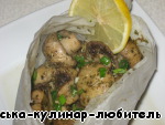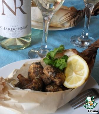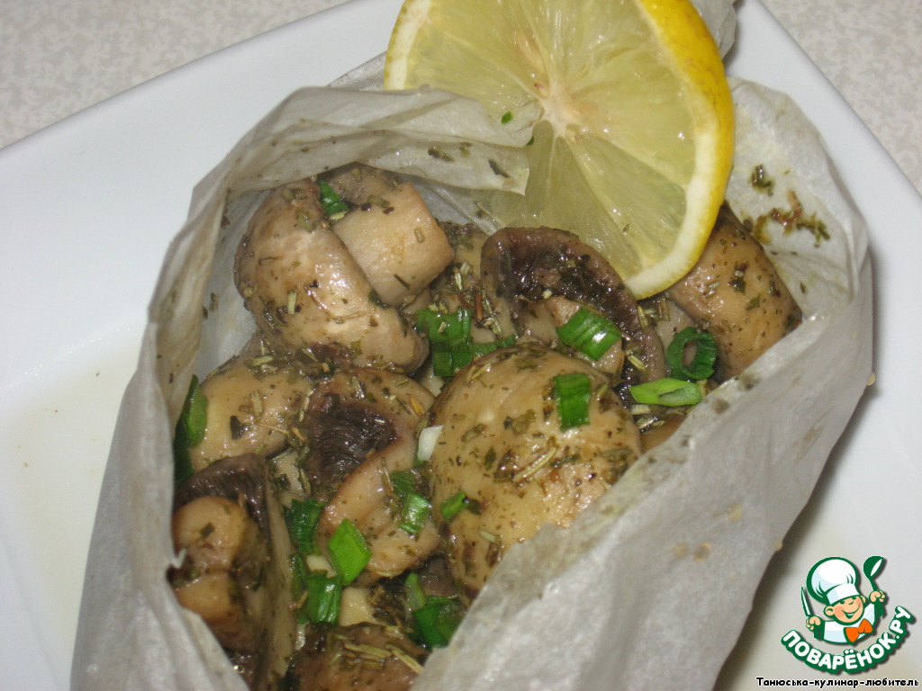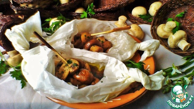 Теперь вырезаем верх бумаги, чтобы получилось лукошко, поливаем каждую порцию грибов 1 ч.л. лимонного сока и украшаем петрушкой. Все, можно перейти к дегустации "Грибного лукошка" с бокалом белого сухого вина!
