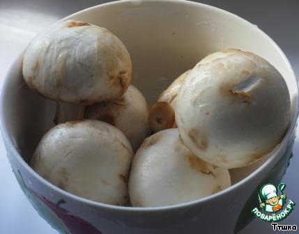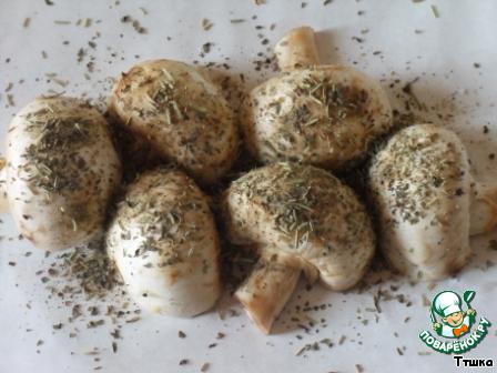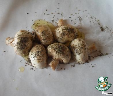 Тепрь оливковым маслом полить шампиньоны, в каждую порцию по 3 ст.л.