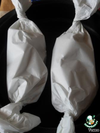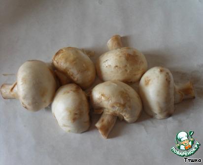 Разрезать их пополам и положить на двойной слой пергаментной бумаги. Так как у нас две порции, то получается в каждую порцию положить по 3 гриба