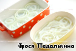 Рыбу заранее разморозить. Лук нарезать кольцами и выложить на дно формы. -