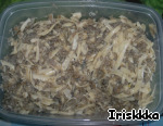Грибы (вешенки) промыть, нарезать, обжарить немного на сковородке с луком. Эту "зажарку" пропустить через мясорубку. Сыр натереть на крупной терке. Смешать грибы и сыр. -