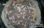 В форму выкладываем блины, каждый смазывая немного сливочным маслом и выкладывая на него начинку