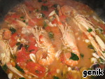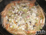 Добавляем ассорти морепродуктов и королевские креветки. Обжариваем на сильном огне. Вливаем белое сухое вино и даем ему испариться