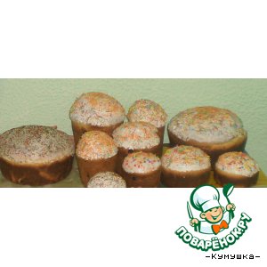 Приготовить глазурь. Для этого взбить в миксере белки в крутую пену, постепенно добавляя по чуть-чуть сахарную пудру. Или развести готовую глазурь так, так указано на упаковке. Быстро смазать остывшее куличики, посыпать посыпкой.