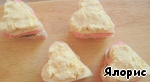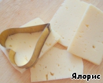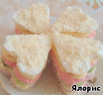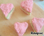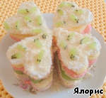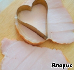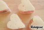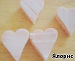 Послойно укладываем начинки на сердечки, перемежая их слоями крема из рикотты: твердый сыр, карбонад, киви. Осторожно прижимаем и ровняем по краям. Слои рикотты лучше формировать смоченными в холодной воде руками, чтобы не размазывалась.