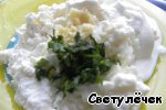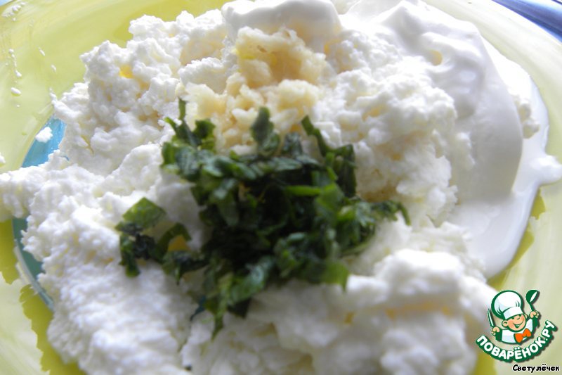 • Готовим начинку: протираем через сито творог, добавляем чеснок, зелень мяты, сметану, соль и перец