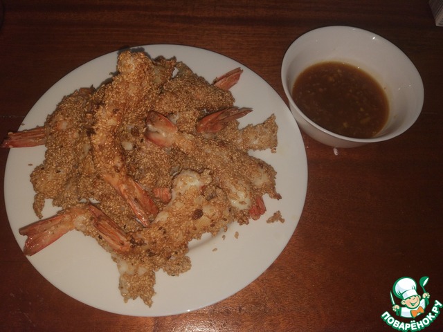 Совет - не насыпайте в тарелку сразу весь кунжут. Он быстро промокает от белка и плохо прилипает к креветкам. Добавляйте его понемногу, а еще лучше просто присыпайте кунжут сверху на креветку, держа ее над тарелкой. -