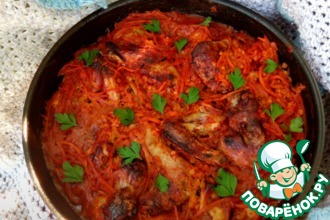 Чахохбили - куриные крылышки (примерно полкило) жарила на сухой сковороде, добавила четыре жареные луковицы, кетчуп(хайнц), острый перец, пряности, немного водички, чеснок и в конце - зелень.