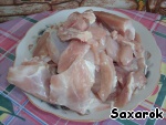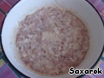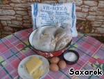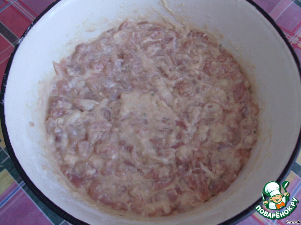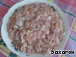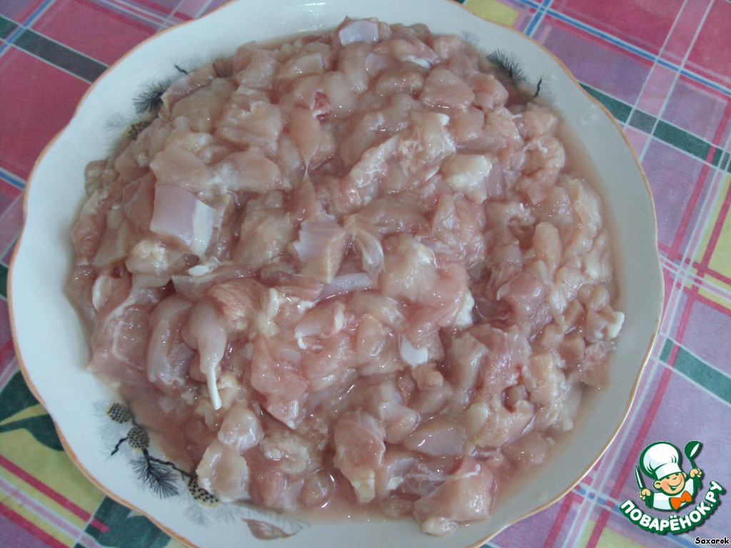 Приготовим тесто: мелко нарезанное мясо курицы, яйца, мука, все перемешиваем