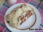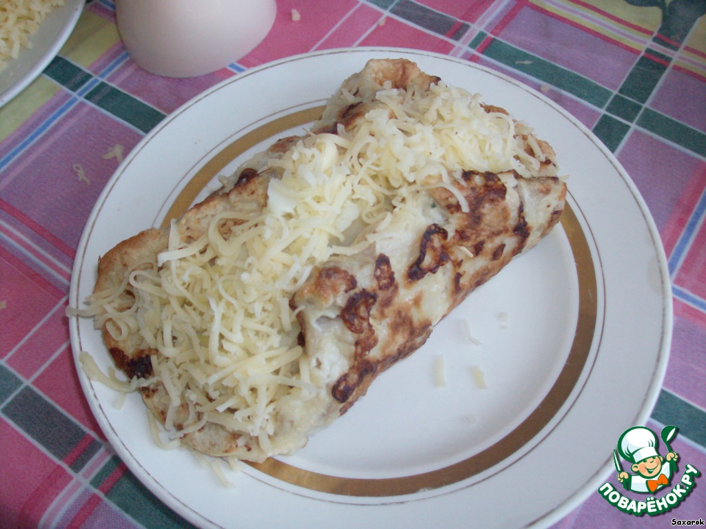 На серединку выкладываем начинку. Это может быть все, что угодно, у меня было картофельное пюре. Посыпаем тертым сыром и ставим в разогретую духовку на 5 минут при температуре 150 градусов