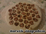 Отрезаем кусок теста, раскатываем, кладем раскатанный пласт теста на пельменницу, начиняем начинкой; раскатываем второй пласт, накрываем сверху, раскатываем скалкой. -