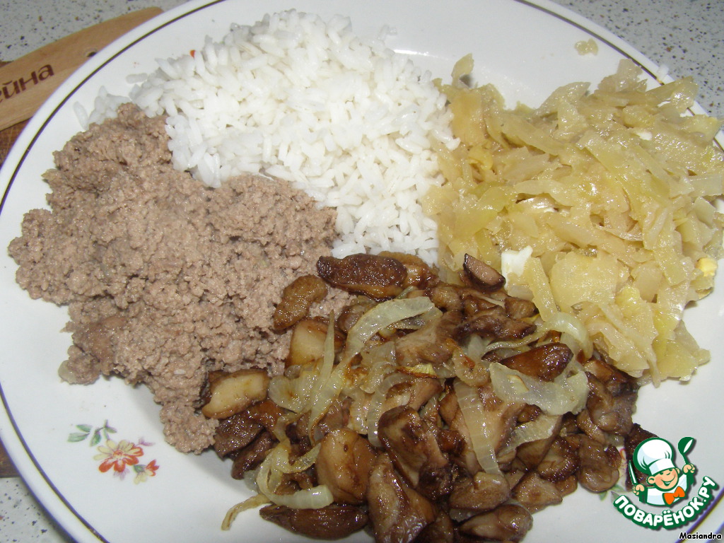 Отвариваем рис, и вот такое вот ассорти из начинок у нас готово.