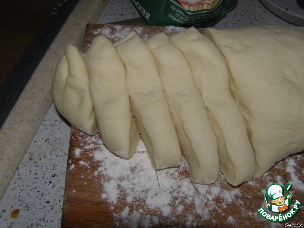 Можно сразу разрезать на небольшие тонкие кусочки, а можно понемногу отрезать для каждого пирожка, или же сформировать кулебяку, пирог, треугольнички - что вашей душе угодно. Тесто нежное, эластичное, благодарное, с таким работать - одно удовольствие. Может немного прилипать к рукам - не страшно, обсыпьте руки мукой. Не добавляйте большого количества муки в тесто - оно потеряет легкость и воздушность, станет грубее.