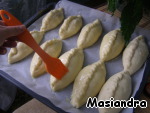 Когда пироги на обоих противнях расстоялись, духовку на температуру 180-200 ставим, пирожки смазываем яйцом или чем больше любите - заваркой, сладким сиропом...