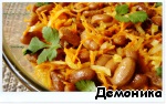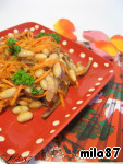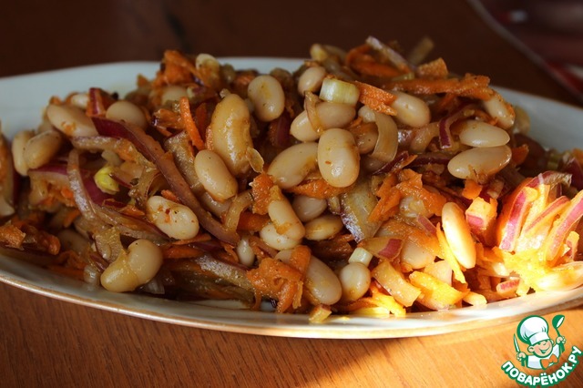 Девочки, по такому же рецепту, можно приготовить мидии, заменив ими фасоль. Получается очень вкусно.