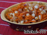 Выкладываем к фасоли маринованный лук (вместе с маринадом) и морковь со специями, добавив соевый соус, всё аккуратно перемешиваем.