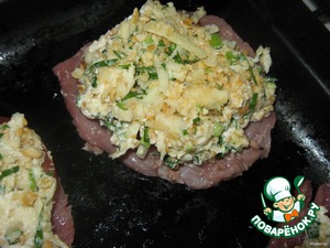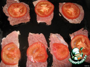 • Выложить мясо на смазанный растительным маслом противень. Помидор нарезать на кружки, выложить на мясо.