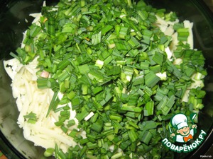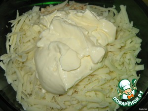 Чеснок измельчить, добавить вместе с майонезом к крекерно-сырной массе.
