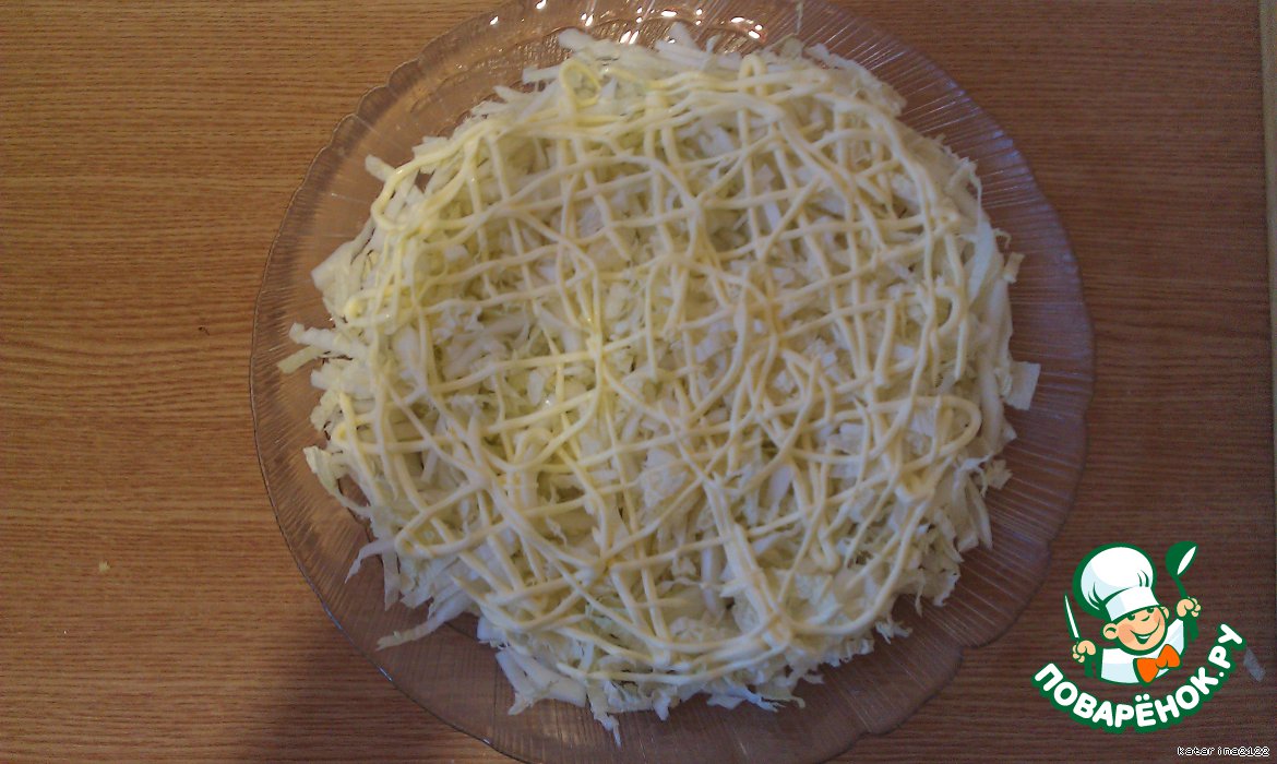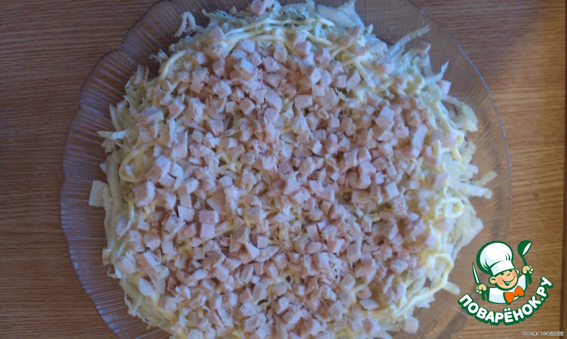 Нарезаем капусту соломкой, присаливаем и рисуем майонезом сеточку. Нарезаем отварное куриное филе кубиками и выкладываем слой поверх капусты.