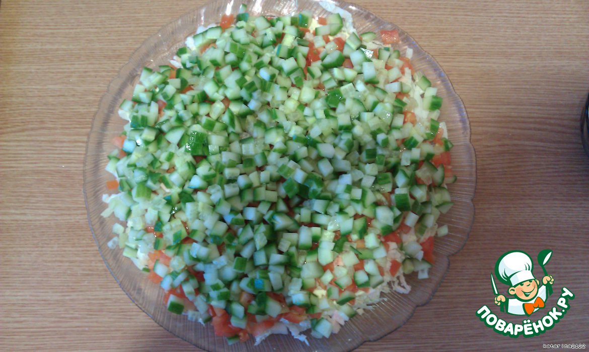 Основа рецепта была взята у знакомой на ДР, но со временем я немного переделала салатик, и получилось ещe вкусней!!! Теперь этот салат завсегдатай наших праздничных столов)