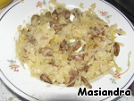 У меня это капуста и грибы. Нарезала лук, слегка припустила на сковороде, капусту нашинковала, добавила к луку, влила стакан воды, посолила и тушила на среднем огне. -