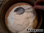 На бисквит надеваем разъемную форму и укладываем крем! Стараемся выровнить поверхность. Убираем в холодильник буквально на 10-15 минут, чтобы крем схватился.