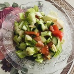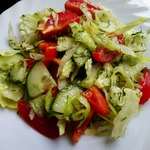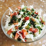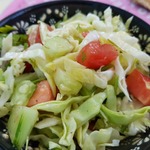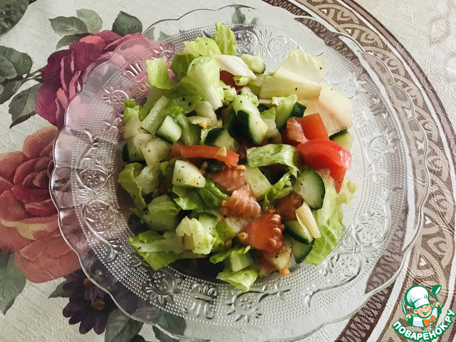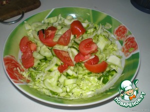 Я готовила из 0,5 кг молодой капусты, 2 помидоров, 3 огурцов, крупных пучков зелени (укроп и петрушка). Салат заправляла подсолнечным нерафинированным маслом и виноградным уксусом, не солила.