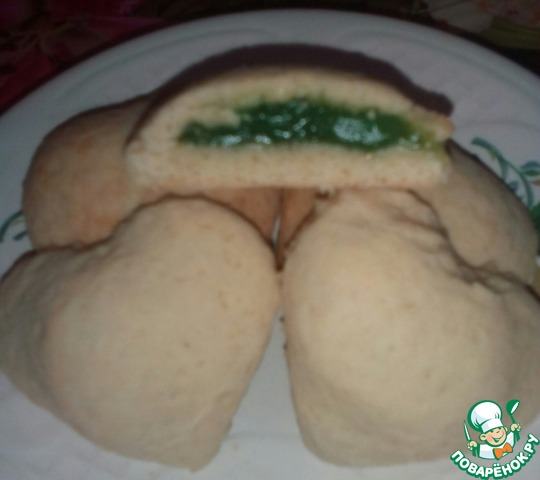 • На один кружок выкладываем начинку (у меня яблочный джем, несколько печенюшек с шоколадными конфетами и одна, "счастливая", с пьяной вишенкой)