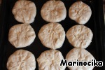 Стол смазываем маслом. Берем шарик, придавливаем в лепешку и смазываем маслом. Раскатываем его как можно больше по столу и сбрызгиваем слегка смесью.