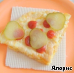 Омлет порционными кусками выкладываем на вафли, перемежая их с нарезанным огурцом и кетчупом.
