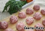 Полученный фарш отбить (скатывая в шар, бросая об стол). Скатать небольшие тефтельки (у меня получилось 15 шт). Обжарить тефтельки с 2-х сторон, убавить огонь, накрыть крышкой, тушить 5 минут.