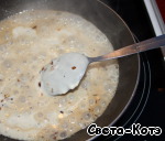 Обжарить мелко нарезанный лук до золотистого цвета. Добавить вино; когда выпарится вино, добавить сметану и хорошо перемешать. -