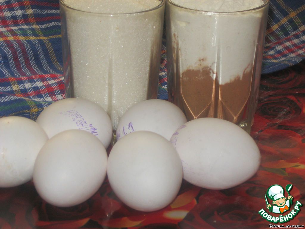 Белки взбиваем с сахаром, затем добавляем понемногу желтки и муку с какао. Подробнее описано здесь https://www.povarenok.ru/recipes/show/54587/