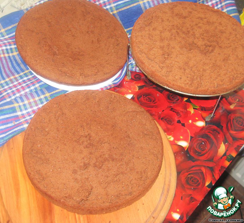 Острым длинным ножом делим бисквит на три одинаковых коржа.