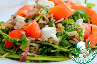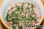 Тунец и салат Мизуна соединить, добавить 1 ст. ложку томатного соуса и перемешать.