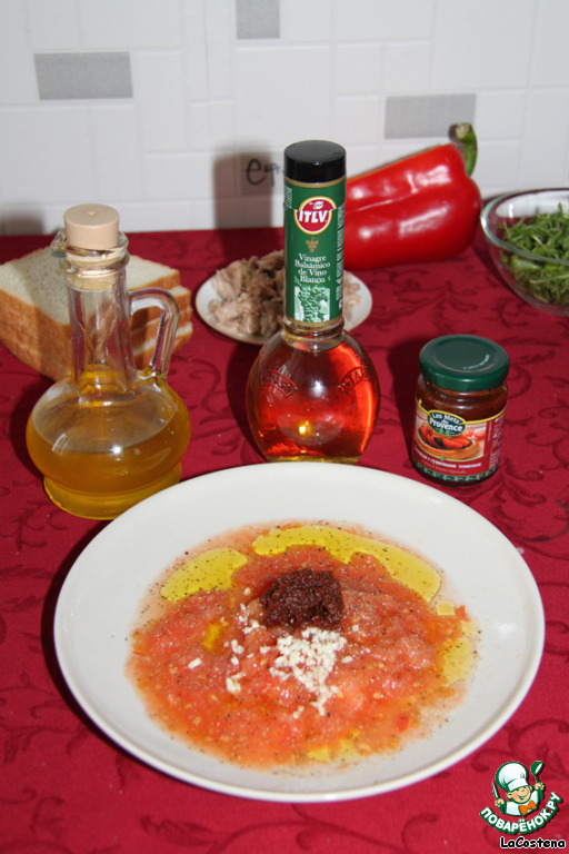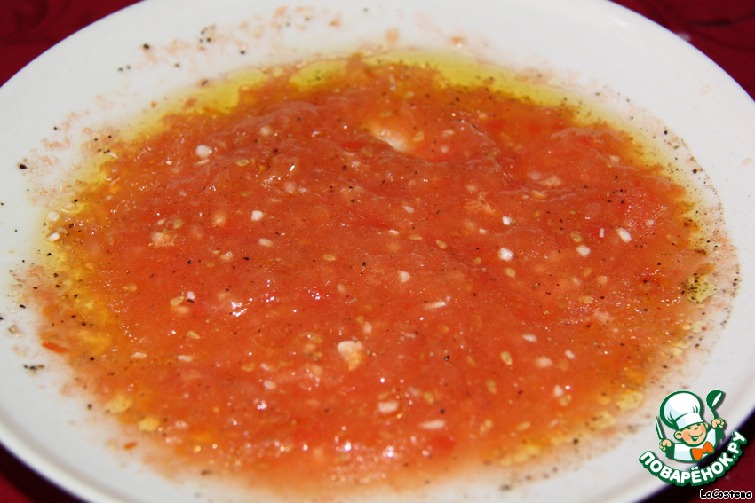 Помидоры натереть на крупной терке, выкинуть кожицу. Добавить нарубленный чеснок, 100 г оливкового масла, 1 чайную ложку уксуса и 1 ст. ложку тапенады из томатов. -