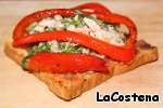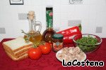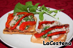 Наши продукты: Хлеб белый для тостов, тунец в собственном соку, красный сладкий перец, спелые помидоры, салат Мизуна, чеснок, оливковое масло, бальзамический уксус и тапенада из высушенных томатов.