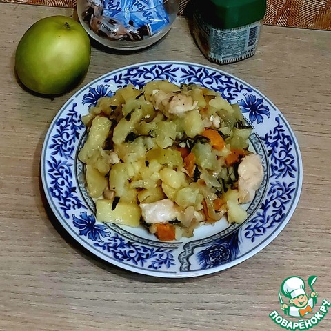 5. В это же масло положить картофель и курицу (постоянно следить за ней), оставив тушиться, через минут 5 - 7 добавить кабачок. Все тушить.