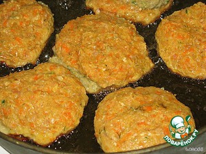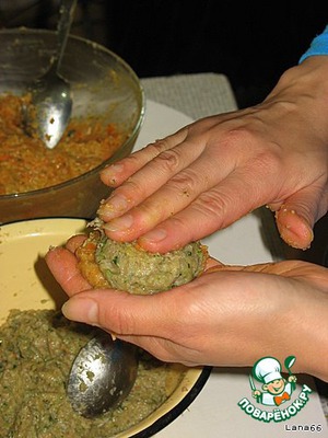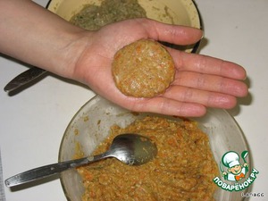 Теперь берем столовой ложкой фарш с морковью, делаем лепешечку.