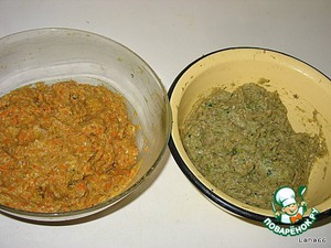 В одну половину добавляем морковь, в другую мелко порезанную зелень. Опять хорошо вымесить.