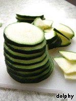 Цуккини нарежьте кружочками, а затем еще на 4 части. -