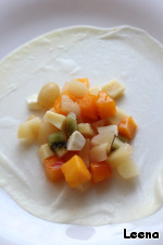 На раскатанный круг выкладываем фруктово-сырный салат.
