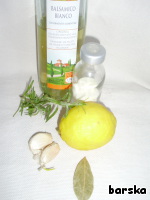 Маринад: вода -150 мл, бальзамический уксус - 30 мл, цедра 1 лимона, сок 1 лимона, соль, 2 зубчика мелкопорезанного чеснока, веточка розмарина, лавровый лист довести до кипения. Шампиньоны порционно опускать в маринад и проваривать по 2 минуты.