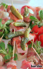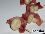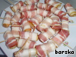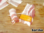 Маринад слить. Каждую полоску бекона разделить напополам и завернуть кусочек крабовой палочки, сколоть зубочисткой. -