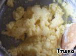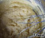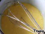 В кукурузную крупу ввести яичную массу, муку, разрыхлитель и сыр, хорошо перемешать или взбить