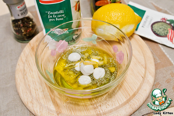 В глубокой тарелке смешать оливковое масло, цедру лимона, розмарин (у меня был сушеный), добавить соль и перец. Положить в смесь моцареллу и оставить мариноваться на 30-40 минут.