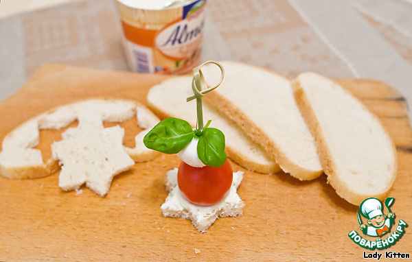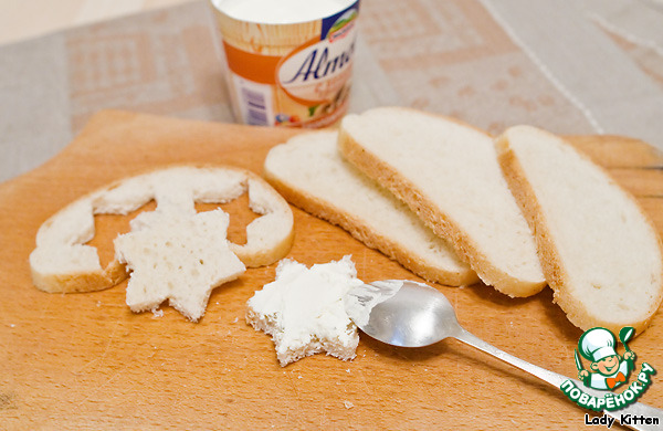 Хлеб нарезать ломтиками, вырезать нужные фигуры. Я делала звездочки формой для печенья. Каждый ломтик смазать творожным сыром.