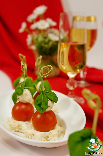 Сверху положить помидор, маринованную моцареллу и листик базилика. Скрепить все шпажкой.